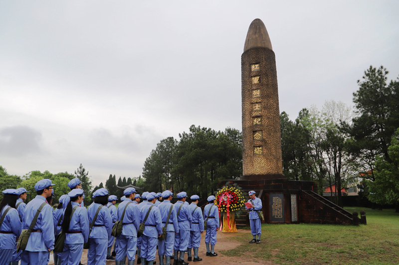 在红军广场烈士纪念塔前,全体学员冒雨列队,向革命先烈默哀致敬、敬献花篮,面对党旗重温入党誓词;在“一苏大”旧址,参与预演选举,高唱《国际歌》;在红井边,尝一尝红井水,缅怀伟大领袖毛泽东。在马道口“长征第一村”,学员们身穿红军服,开展队列训练,颂读《红色家书》,喝一口壮行酒,出发重走长征路,随后模拟闯关夺隘、抢救伤员、爬雪山过草地、飞夺泸定桥······将仪式教学和体验教学相结合,深入体会长征精神。