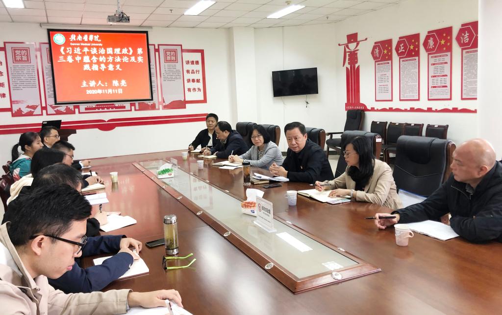 陈亮强调,《习近平谈治国理政》第三卷中蕴含的方法论是丰富多样的。作为学校的重要服务部门,一定要认真领会,积极实践,自觉加强思想提升、政治历练和实践锻炼,不断增强“四个意识”,坚定“四个自信”,坚决做到“两个维护”,切实提升工作能力,做到想干事、能干事、干成事,自觉担负起服务师生、服务学校的重要责任,为学校造就德技双馨良才、办人民满意医科大学作出贡献。