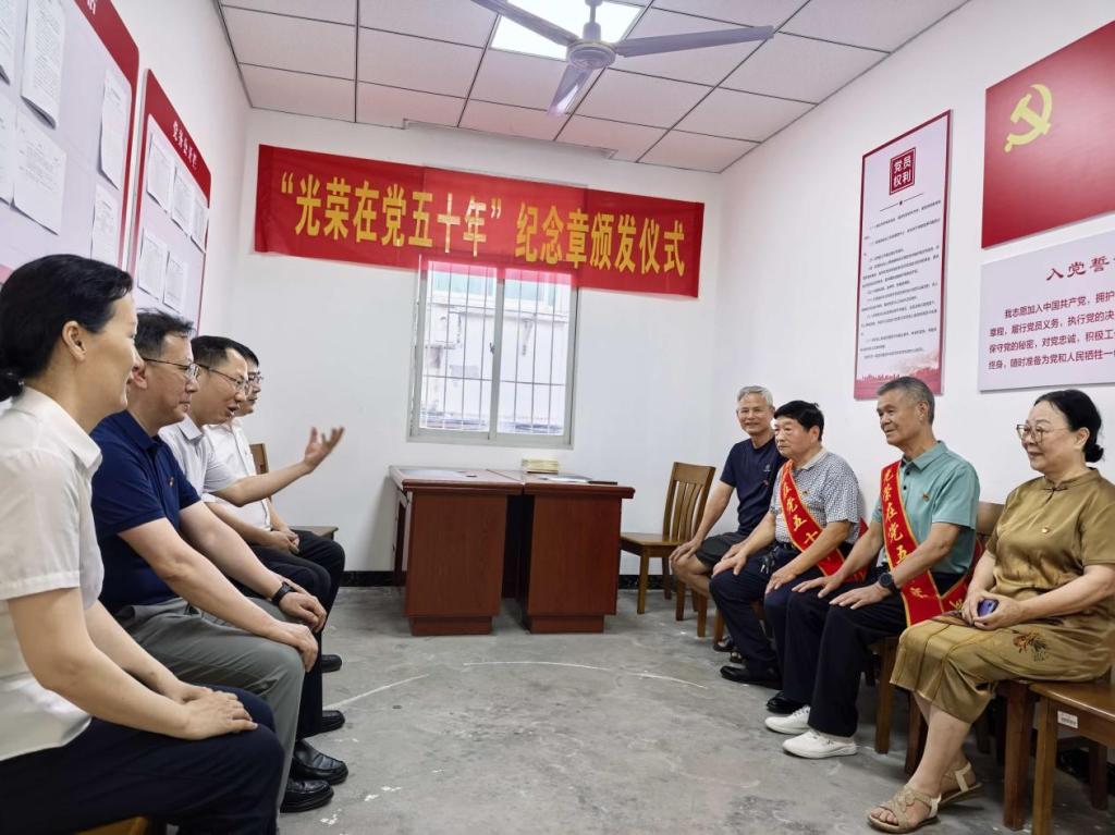 黄瑞忠为李锋、王克仁颁发“光荣在党50年”纪念章并送上慰问金,向他们表示衷心祝贺,并与他们亲切交谈,详细询问近来的身体情况和生活状况,聆听他们对学校改革发展的意见建议。